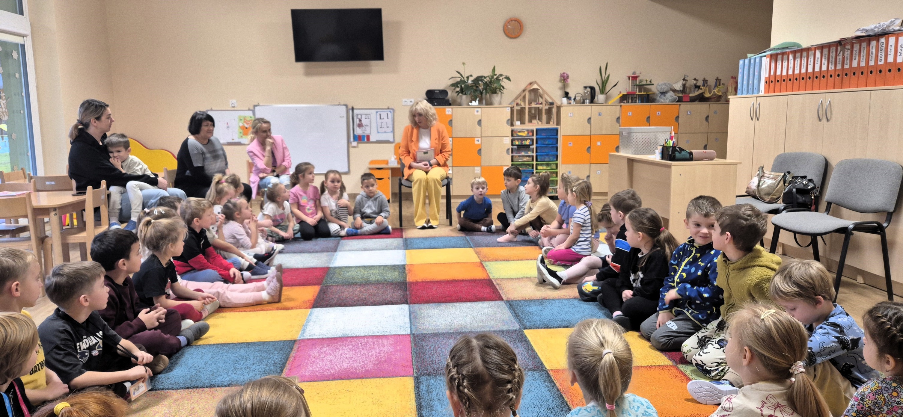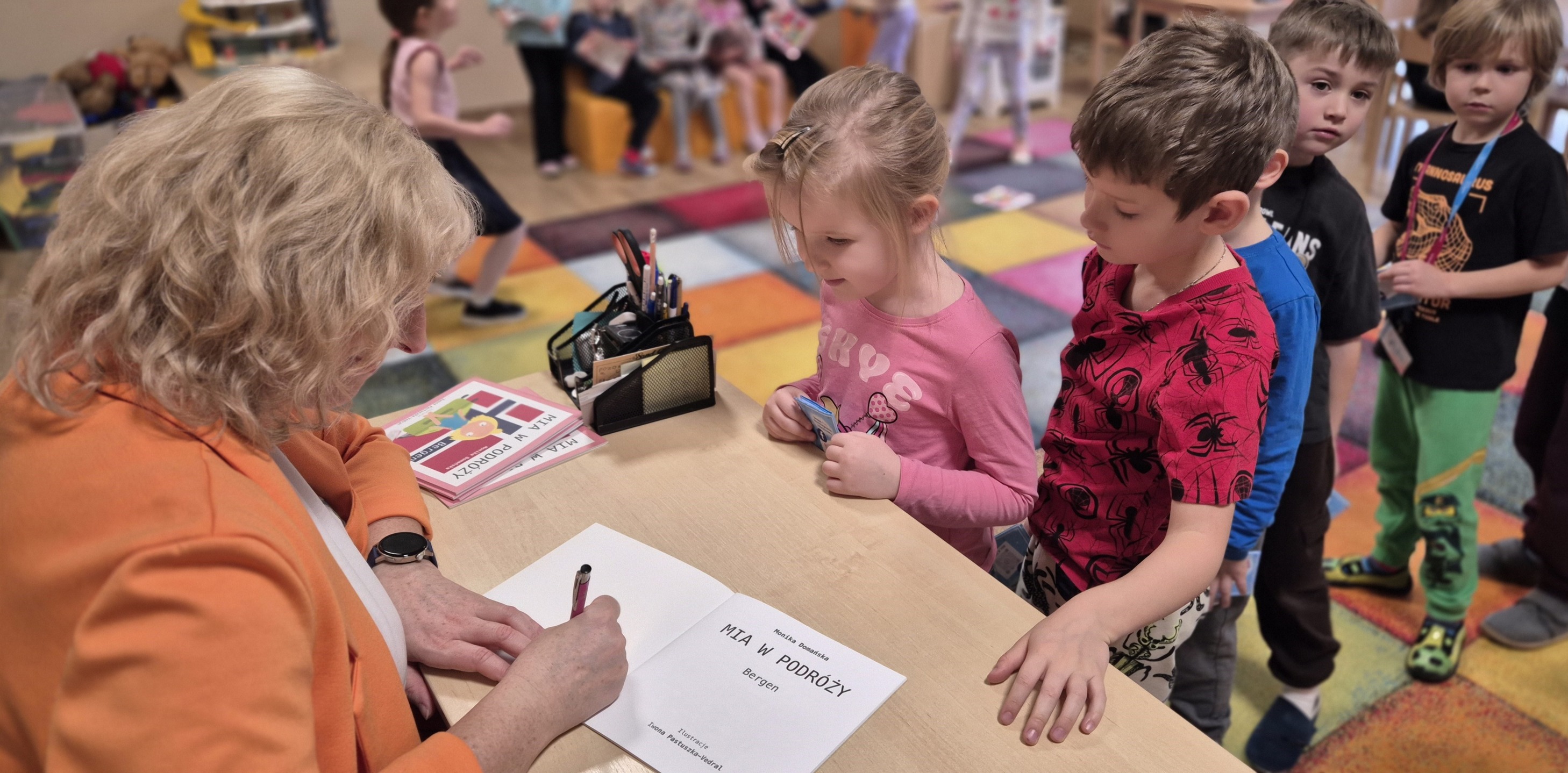 26 listopada 2025 r. Grupę Pomarańczową i Żółtą odwiedziła Monika Domańska – autorka książek dla dzieci z cyklu „Mia w podróży…”. Pani Monika to pisarka i mama, która połączyła swoje dwie największe pasje – podróże i literaturę – tworząc wyjątkowy projekt inspirowany wspólnymi wyprawami z córką. Tak narodziła się Mia – ciekawa świata dziewczynka, która zabiera małych czytelników w fascynujące podróże. Podczas spotkania autorka opowiedziała dzieciom, na czym polega jej praca, skąd czerpie pomysły i co jest potrzebne, aby powstała książka. Przedszkolaki z dużym zainteresowaniem wysłuchały fragmentów historii czytanych przez samą autorkę. W pewnym momencie w sali pojawiła się również bohaterka opowieści – Mia, która porwała dzieci do wspólnego, radosnego tańca. Na zakończenie każdy przedszkolak otrzymał książkę z wyjątkową, imienną dedykacją. To było inspirujące i pełne wrażeń spotkanie!