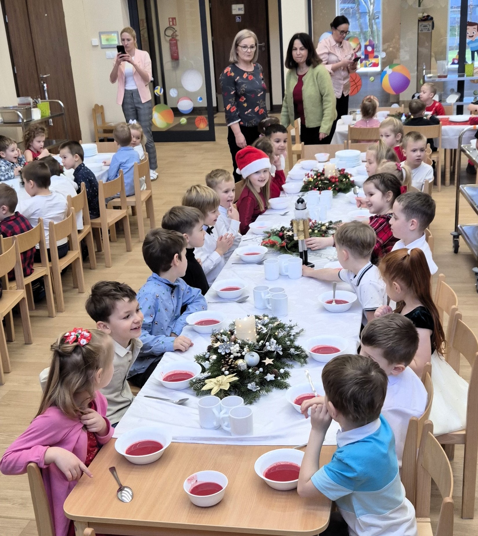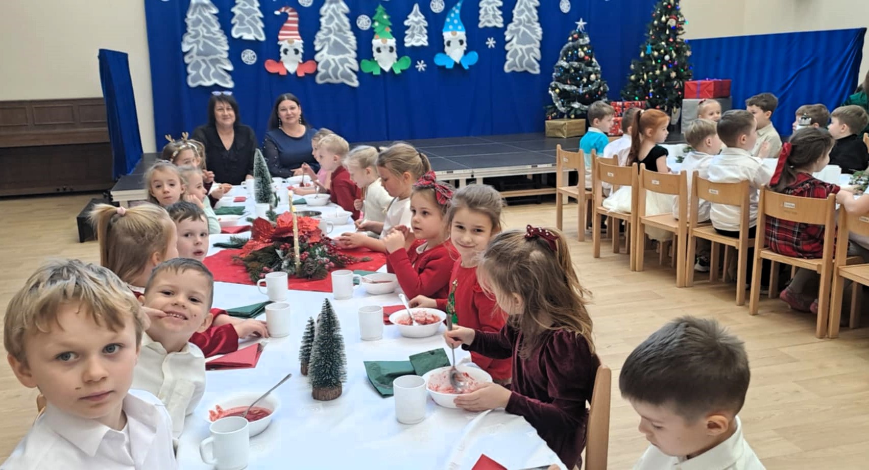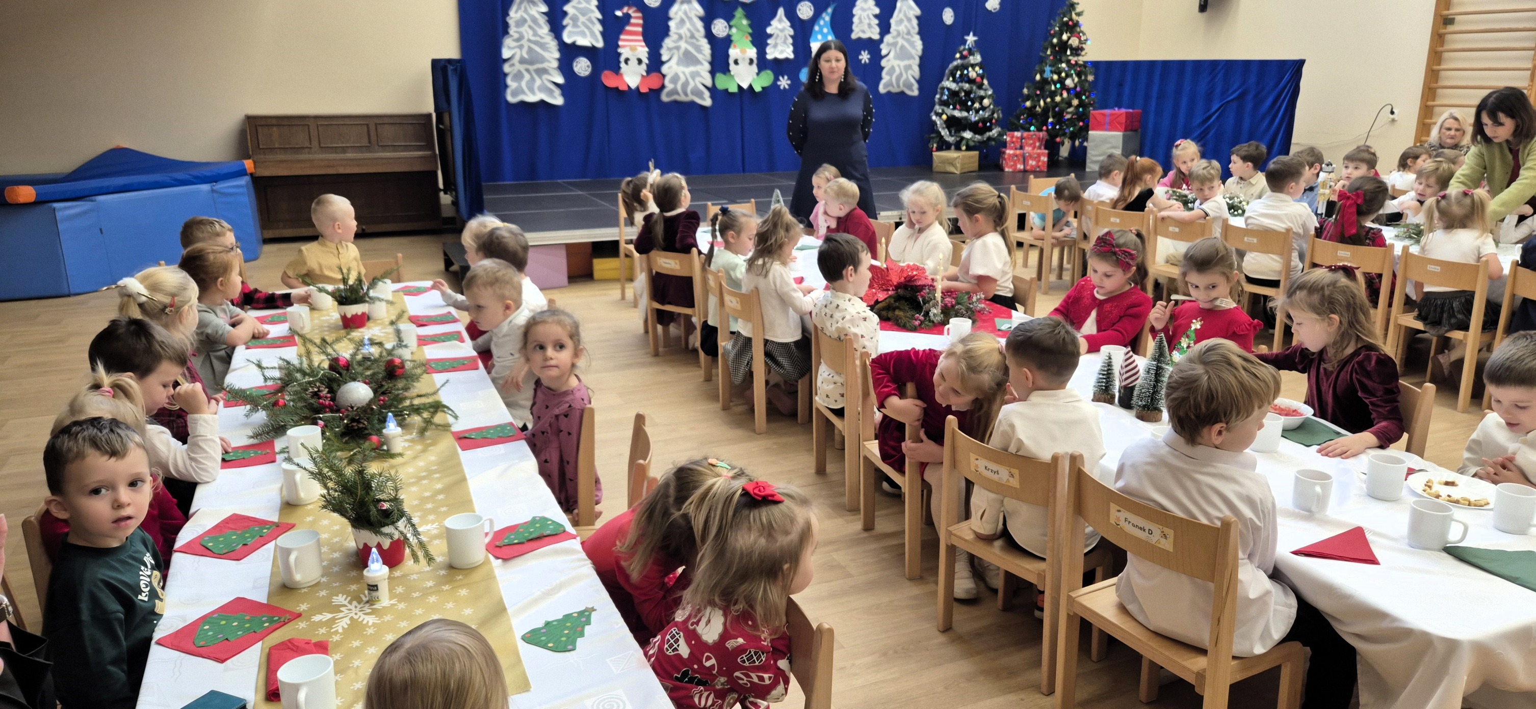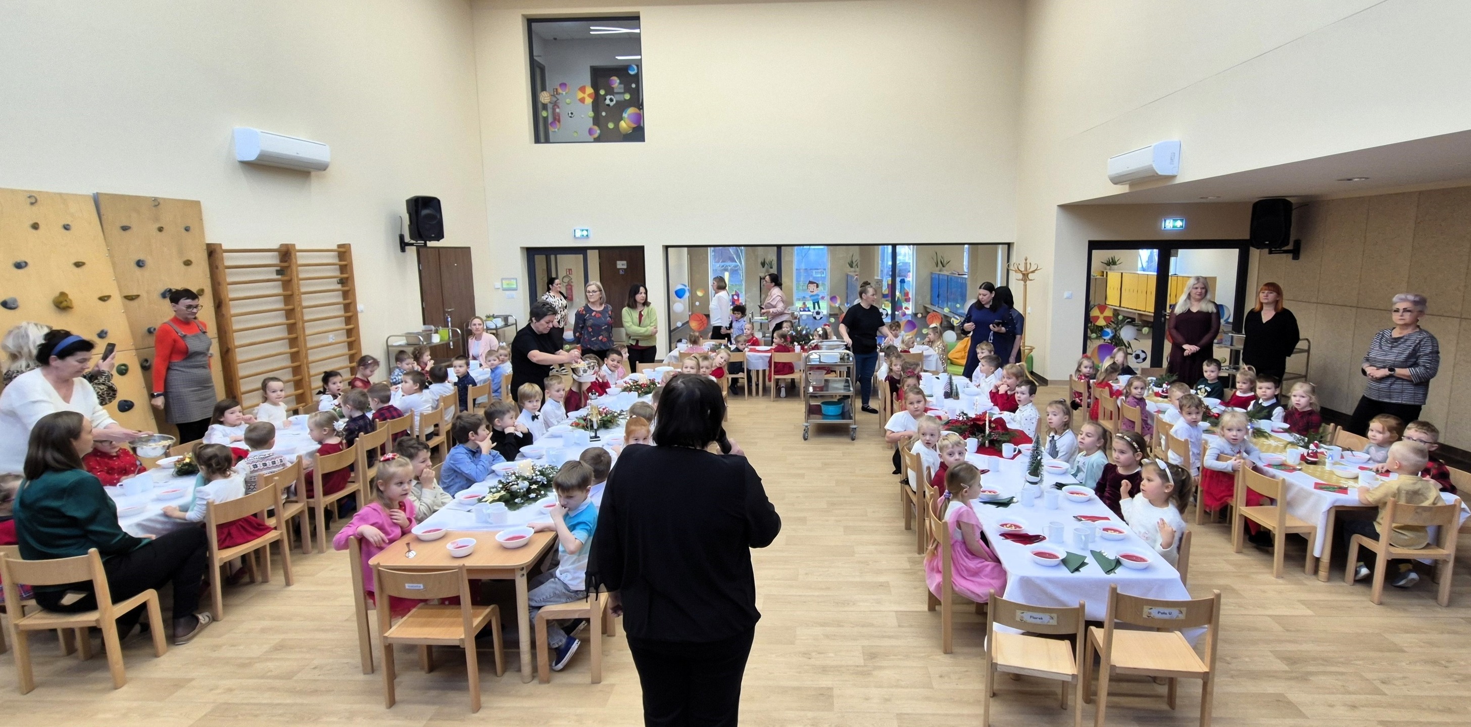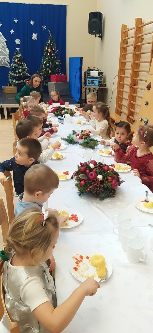 19 grudnia 2025 r. w naszym przedszkolu odbyła się uroczysta Wigilia. Pani Dyrektor złożyła wszystkim dzieciom oraz pracownikom placówki serdeczne bożonarodzeniowe życzenia i zaprosiła do wspólnego biesiadowania. Przy dźwiękach kolęd dzieci ze wszystkich grup zasiadły do wspólnego obiadu. Tradycyjnie podano czerwony barszczyk oraz smażoną rybkę. Była to wyjątkowa, ciepła chwila, kiedy cała przedszkolna społeczność mogła być razem, dzieląc się radością i świąteczną atmosferą.